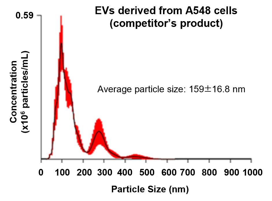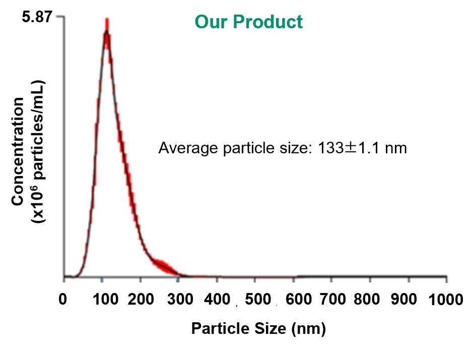 Using Nanoparticle Tracking Analysis (NTA) with NanoSight, particle size analysis was performed on “Exosomes, from COLO201 cells, purified(CD63)” and competitor’s products.