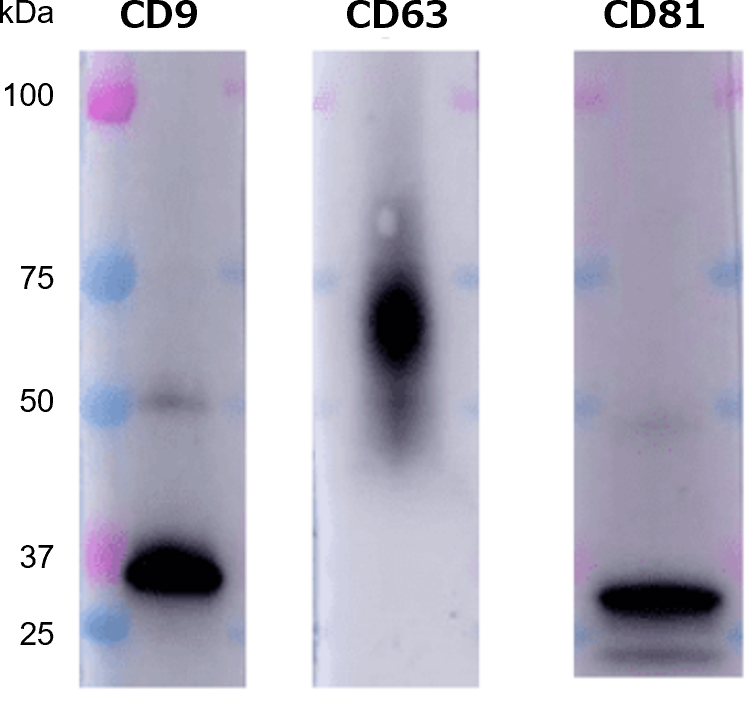 Non-reducing SDS-PAGE was performed for 10 ng/Lane of “Exosomes, from COLO201 cells, purified(CD63)”, and the EV marker proteins, CD9/CD63/CD81, were detected with antibodies.