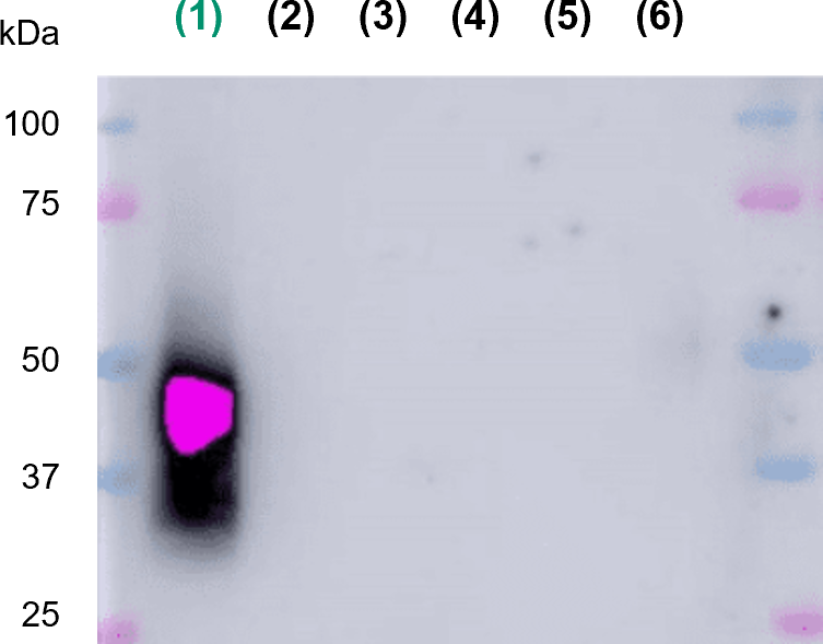 “Exosomes, from COLO201 cells, purified(CD63)” and five EVs from other companies were compared to see whether CD63 signal could be detected. All were applied at a concentration of 10 ng/Lane based on the concentrations determined by each manufacturer.