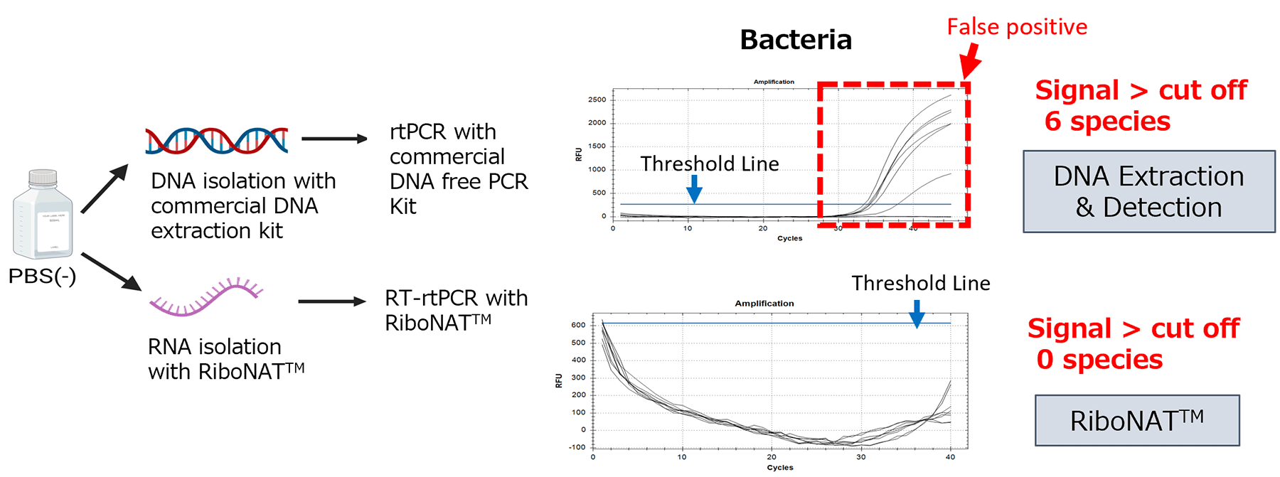 RiboNAT™ includes treatment steps with a reagent for inactivating DNA from dead cells and DNase. This process helps reduce false positives caused by residual DNA in the sample.