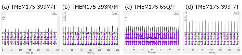 393M/T モデル、393M/M モデル、65Q/P モデルにおける、DCPIB (50 mM) 処置後の平均発火間隔変化。65Q/P 変異モデルでは処置後 1 時間で顕著な平均発火間隔の増加が観察されたのに対し、393T/T 変異モデルでは処置後 15 時間で顕著な増加が観察されました。