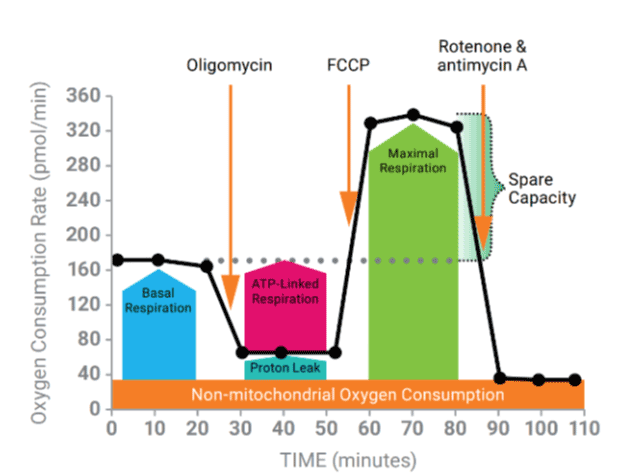 WT (iCell® DopaNeurons) および A53T (iCell® DopaNeurons SNCA A53T HZ, 01279) 細胞の生体エネルギー分析の比較において、酸化的リン酸化脱共役剤である FCCP (carbonyl cyanide 4-(trifluoromethoxy)phenylhydrazoneと最大呼吸能力への応答が A53T 変異細胞で大きいことを示しています。