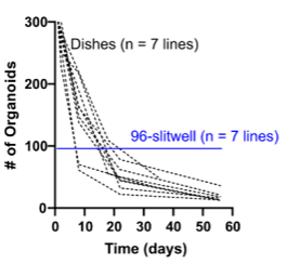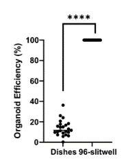 - 96スリットウェルプレートで培養されたオルガノイドは、数の減少が最小限で、高い生存率、均一なサイズ、安定した成長を示しました。