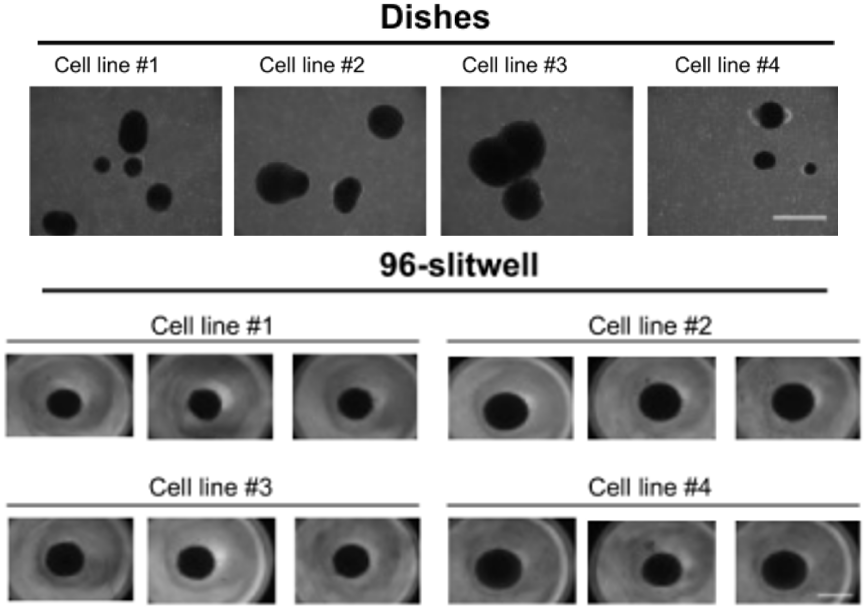- 96スリットウェルプレートを用いた培養により、オルガノイドの生産効率とサイズ均一性が著しく向上し、従来法よりも安定した培養が可能となりました。これにより細胞株間および実験間のバラツキが低減され、再現性と信頼性の向上に寄与します。初期スフェロイドの形成の均一性も、培養の再現性を支える上で重要な役割を果たしました。