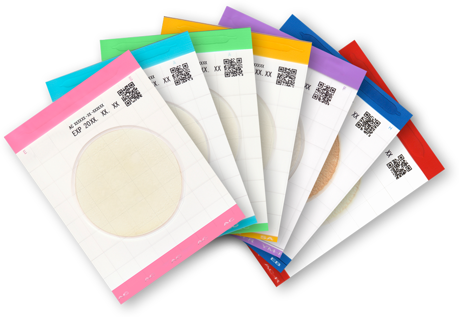 培養に必要な栄養成分などをシート状のフィルムにコーティングした製品で、シャーレを使用した従来の寒天培地に比べ、培地の調製時間、作業スペース、廃棄量の削減、さらに、コロニーの視認性の良さから計測時間の削減も期待できます。