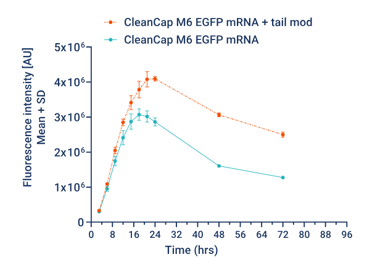 TriLink社独自のModTail poly(A)tail 修飾は全体的なタンパク質発現とその持続性を向上させます。