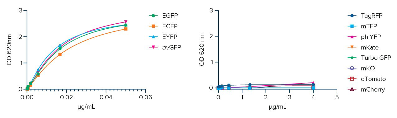 AffiniPure-VHH® 抗-GFP抗体は、非常に低濃度であっても、avGFP とその誘導体を認識するが、TagRFP、mTFP、phiYFP、mKate、Turbo GFP、m Kusabira Orange、dTomato や mCherry とは反応しないことが示された。