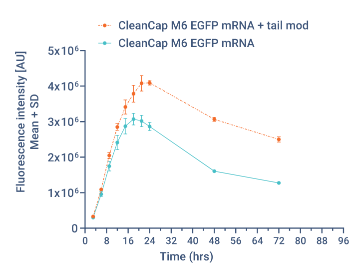 TriLink社独自のModTail poly(A)tail 修飾は全体的なタンパク質発現とその持続性を向上させます。