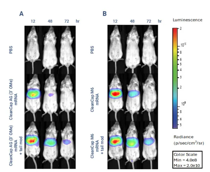 PBS (最上段)またはFluc mRNA:LNPが投与されたマウスを12,48,72時間後に全体の発光をイメージングした。CleanCap® AG 3’ OMe(図A)とCleanCap® M6(図B)でキャッピングされたFluc ModTail mRNA(最下段)では、より長い時間高い発現シグナルが見られた。