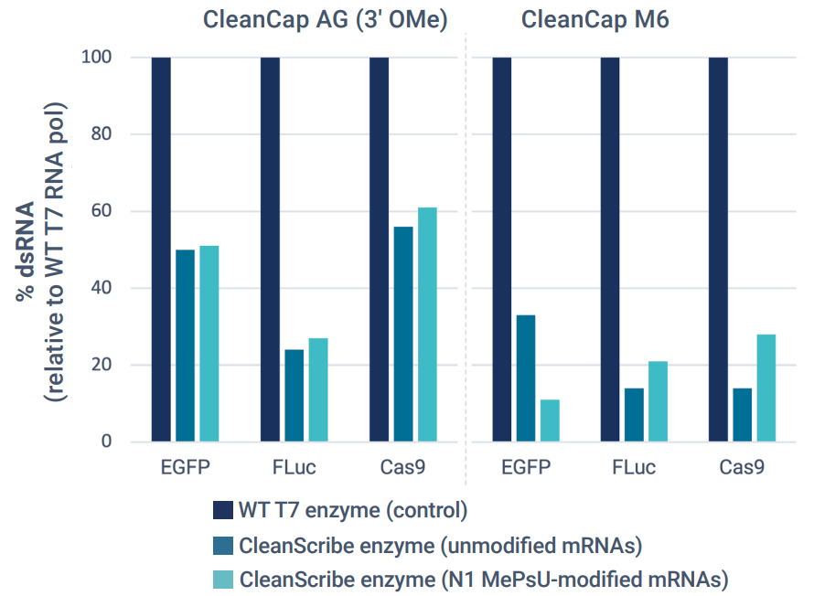 CleanCap® AG (3’ OMe) と CleanCap® M6 でキャッピングしたmRNAでは、 N1-メチルシュードウリジン修飾の有無に関わらず、改変型 RNA PolymeraseによってdsRNAの形成が抑制された。