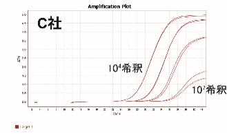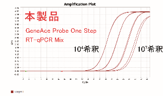 【結果】 本製品は他社試薬と比較して微量RNA試料 (107希釈) に対しても高い増幅効率が得られることが確認された。