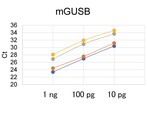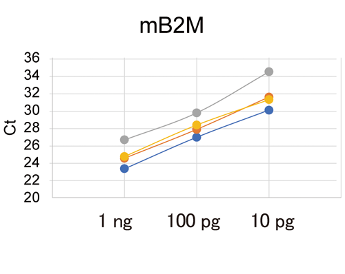 マウスから抽出したTotal RNA (1 ng、100 pg、10 pg) を鋳型として用いて、各社One Step RT-qPCR試薬を使用してCt値を比較した。PCRサイクル条件は、各社の推奨プロトコールに従って実施した。