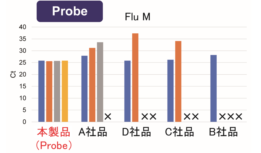 H1N1 Influenza RNA (104, 105, 106, 107希釈) を鋳型として用いて、各社One Step RT-qPCR試薬によりFlu M遺伝子のCt値を比較した。PCRサイクル条件は各社の推奨プロトコールに従って実施した。