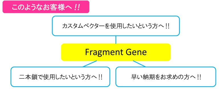 - 二本鎖フラグメントなのでカスタムベクターに簡単に挿入可能