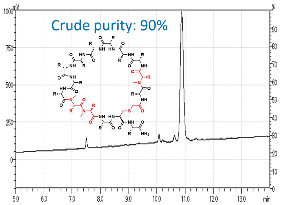 - 酸で分解しやすいN-アルキルアミド構造を有する特殊環状ペプチドを合成し、90%以上の高純度で粗体ペプチドを取得