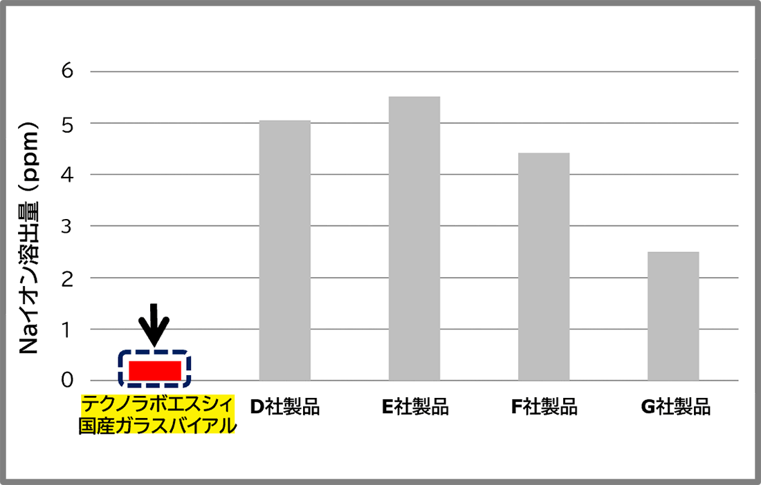 他社製品と比較し、国産ガラスバイアルはNaイオンの溶出が少ないことが分かります。