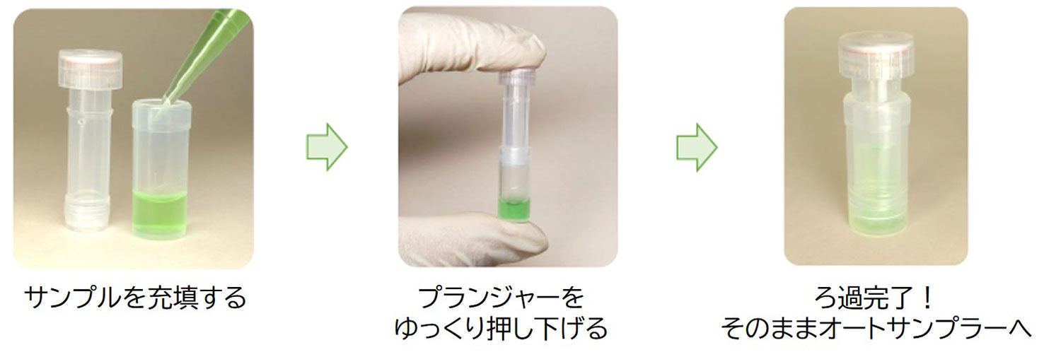 ワンプッシュでサンプルろ過後、そのままオートサンプラーにセットすることが可能で、シームレスな分析を実現します。また、シリンジやシリンジフィルターが不要なため、廃棄物や保管スペースを削減できます。