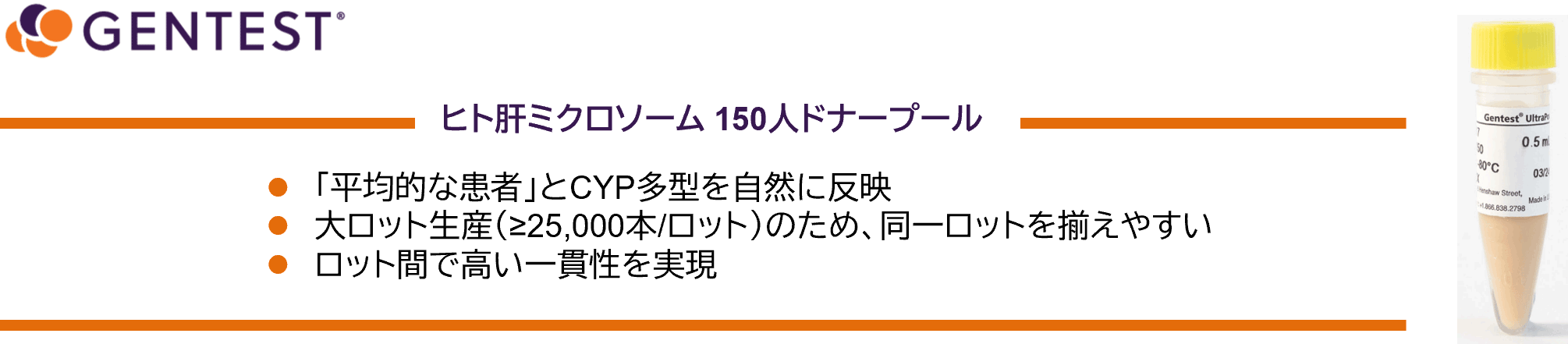 Gentest® Human Liver Microsomes UltraPool™は、ヒト肝ミクロソームとして初めて市販された150人の大規模ドナープール製品です。「平均的な患者」とCYP多型が自然に反映されており、複数の薬物代謝酵素に関してロット間で再現性のあるデータの取得が可能です。