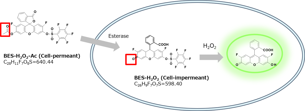 BES-H2O2-Ac and BES-H2O2 are fluorescent probes for the detection of hydrogen peroxide (H2O2) in living cells2). Compared with the conventional fluorescent probe dichlorodihydrofluorescein (DCFH), they exhibit greater specificity for hydrogen peroxide, resulting in reduced background fluorescence. These probes are suitable for live-cell imaging by fluorescence microscopy as well as for analysis by flow cytometry.