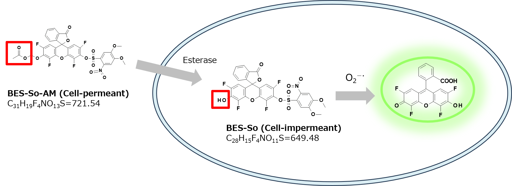 BES-So-AM and BES-So are fluorescent probes for detecting superoxide in living cells2-3). These probes emit fluorescence through a redox-independent mechanism. Compared with the conventional probe, hydroethidine, they exhibit higher specificity for superoxide, resulting in reduced background signals. Therefore, they are suitable for live-cell imaging by fluorescence microscopy as well as for cell analysis by flow cytometry.