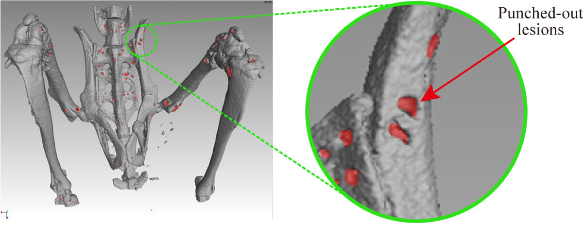 Punched-out lesions (red area) were clearly observed in femur, tibia, coxa and sacral vertebra of the mice using the three dimensional CT imaging.